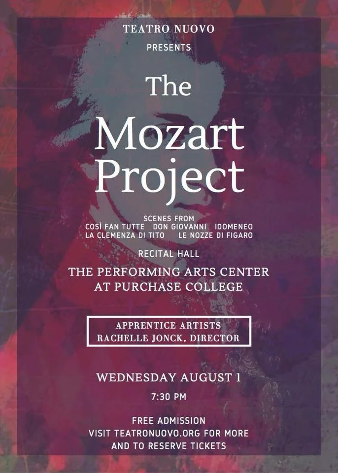 Though we don't always think of Mozart as a "bel canto" composer, he most assuredly was one; he spent most of his time working with and writing for native Italian singers, and if he had lived even to the age of 55 he would have been sharing artists and seasons with a certain Rossini. Tonight's program, selected from the roles our Apprentice Artists have studied and listed in the program insert, draws on Mozart's five mature Italian works: Idomeneo, Le nozze di Figaro, Don Giovanni, Così fan tutte, and La clemenza di Tito."